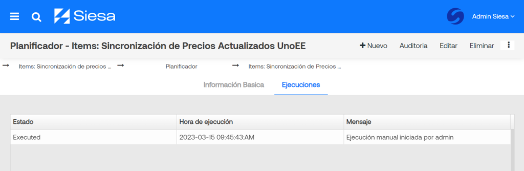 También es posible observar las ejecuciones que se han realizado accediendo a la pestaña “Ejecuciones”: